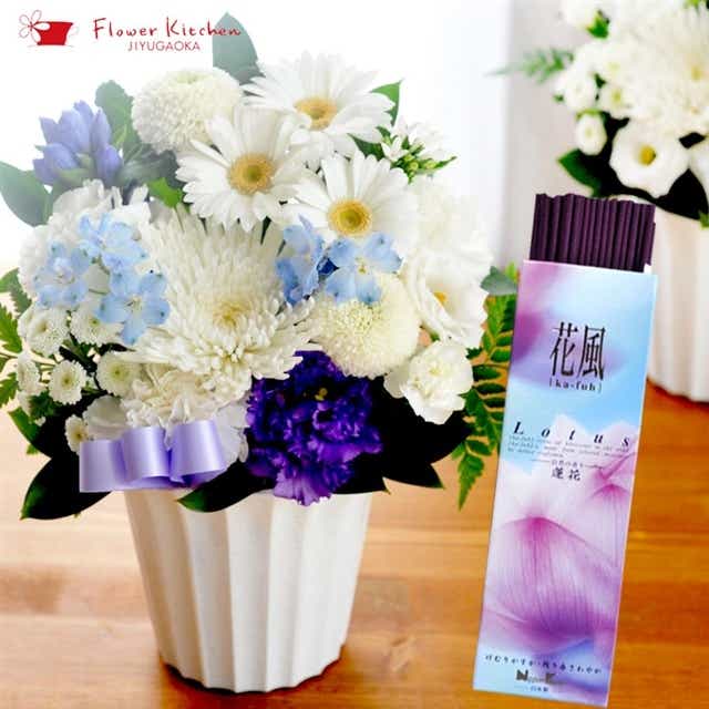 お供え花と線香のセット お供えアレンジsサイズ 白 青紫系 と花風線香 蓮花 ロータス 線香 生花 アレンジメント 籠花 お悔み お供え 送料無料 喪中見舞 お盆 お彼岸 Flowerkitchen Jre Pointが 貯まる 使える Jre Mall